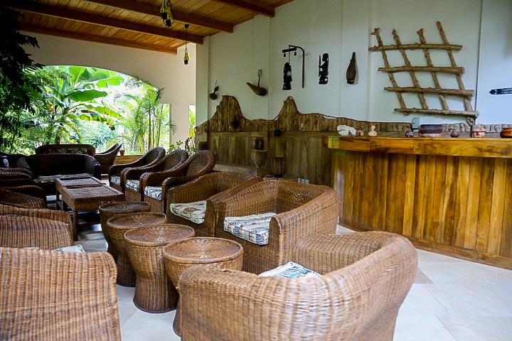 The bar is located in a large traditional Chagga pavilion hut with an outside terrace on the lush green lawns of the hotel.