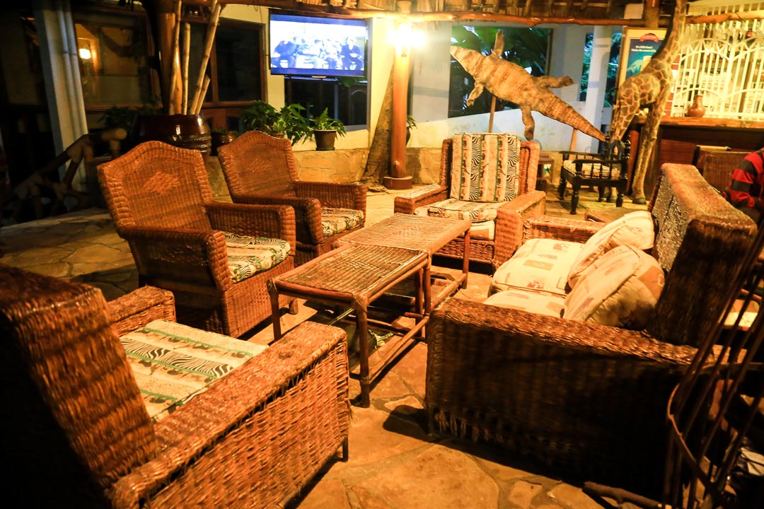 The bar is located in a large traditional Chagga pavilion hut with an outside terrace on the lush green lawns of the hotel.